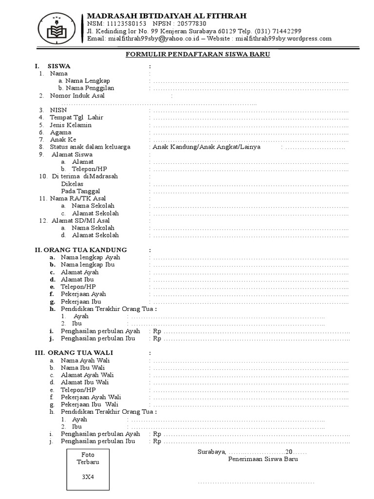 Contoh Formulir Pendaftaran Siswa Baru Madrasah Ibtidaiyah