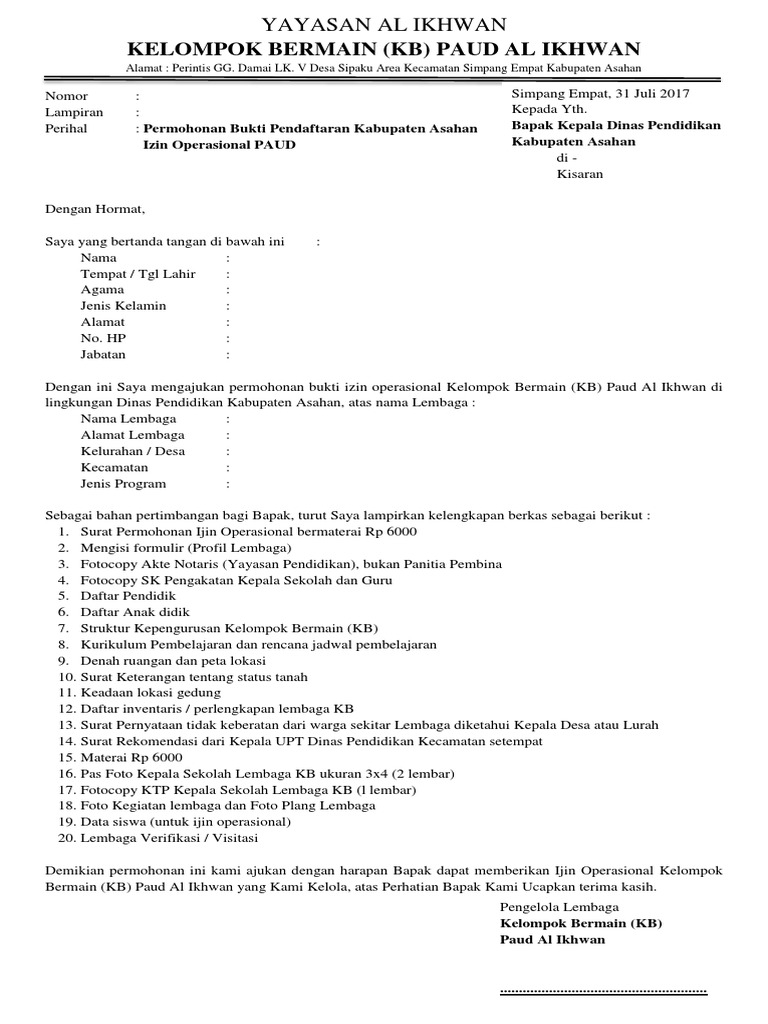 Contoh pengajuan surat ijin operasional paud filenya. Contoh Proposal Pendirian dan Operasional PAUDTK Tahun 2019 harus dilengkapi proposal pengajuan pendirian diantaranya Surat permohonan izin operasional sekolahTK yang dibuat oleh Yayasan dan ditujukan kepada Kepala Badan Usaha Pelayanan Perizinan Terpadu BPPT Kabupaten Kota Kepala Dinas Pendidikan KabupatenKota dan Kepala Unit Pelaksana Teknis Dinas UPTD. Mungkin itu yang dapat saya sajikan pada kesempatan ini semoga CONTOH.